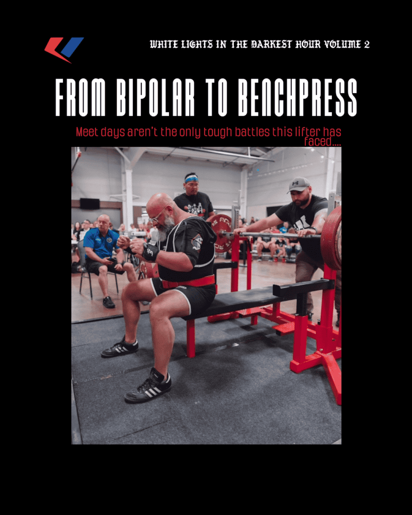 “I started with a Xanax prescription for anxiety in 2010. By 2012 I was taking Xanax and Ambien all day long. My wife didn’t know until I fell asleep at the wheel one day about noon headed home from a shopping trip. Shortly after that I came close to overdosing, had a psychotic break at the end of 2012 and ended up at inpatient drug rehab in Norton, Kansas. I was diagnosed with bipolar 2 upon graduating. I needed something to focus on, and that something was powerlifting.”